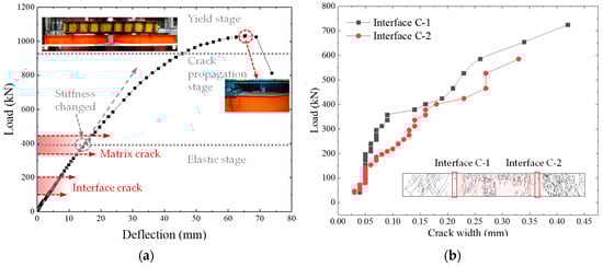 As shown in Figure 11a, the loading process can be divided into the same three stages: (1) elastic stage, (2) crack propagation stage, and (3) yield stage. The elastic stage is defined as an applied load less than 400 kN; a crack could be found in the joint interface. The crack propagation stage refers to an applied load less than 950 kN; the small and dense cracks propagated in the specimen, and the main crack (the crack which was larger and developed faster than the rest) gradually appeared at the joint interface. Furthermore, the stiffness of the specimen decreased slightly. The specimen develops to the yield stage when the applied load exceeds 950 kN; the deflection increased rapidly and the stiffness of the specimen decreased significantly—simultaneously, the width of the main crack increased drastically. At 1033.9 kN, the I-shaped steel girder bucked close to the loading point and the test terminated.