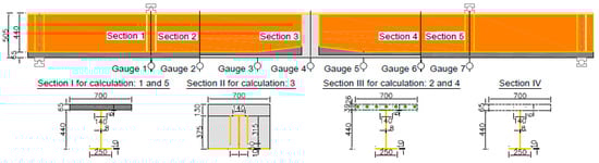 The nominal strength calculation method was identical to the comparative scheme. Considering that the crack width in the mid-span was extremely small, the yield value (1033.9 kN) was employed. The calculation results are listed in Table 5. The calculation sections are depicted in Figure 12.