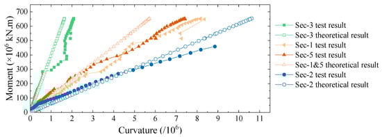 Figure 13 displays the theoretical curvatures of sections I, II, and III (sections shown in Figure 12). The theoretical curvatures used the calculation method of ideal elasticity. It is seen that the stiffness at the joint interface was greatly reduced, and for the cracked section (Section III, ignored the tensile strength of UHPC), the theoretical value can better fit with the test result. While for the other sections, the theoretical value shows great agreement with the test value.