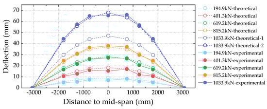 In Figure 14, the deflections of seven measurement points (the gauge 1–7 in Figure 12) were plotted with every 200 kN and compared to the theoretical value calculated by Section III. The comparative result showed excellent agreement before 815.2 kN. When the applied load reached 1033.9 kN, the theoretical value (1033.9 kN—theoretical-1) calculated by using Section III was a greatly underestimated experimental result; alternatively, the curve of 1033.9 kN—theoretical-2 calculated by Section IV (Figure 12, the section of I-shaped steel girder) was in good agreement with the final deflection. This indicates that when the specimen broke, the steel bars in the UHPC panel yielded, and the applied load was completely borne by the I-shaped steel girder.