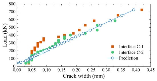 According to Rafiee [], when the maximum crack width of UHPC does not exceed 0.05 mm, the crack has no influence on the durability of UHPC. In addition, the cracks are difficult to observe with the naked eye in practical engineering when the maximum crack width is smaller than 0.05 mm []. Thus, the allowable crack width is defined as 0.05 mm for the steel-UHPC composite specimen, and the corresponding load can be called the cracking load. Thereby, the nominal cracking stress in UHPC is attained by using a representative load, which causes a maximum crack width of 0.05 mm in UHPC.