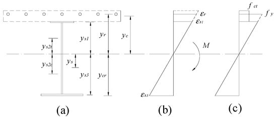 The analysis of the structural stiffness indicates that the steel rebars yield before the buckling of the I-shaped steel web. Thus, the calculation of the ultimate flexural capacity of the structure should consider the assumption of the yield of the steel rebar. The cracked section (Section III in Figure 9) was employed to calculate the section characteristics. Figure 16 shows the calculation diagram.