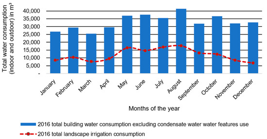 - A water balance to allow for the comparison of an onsite system as opposed to the use of municipal desalinated potable water. The water consumption records are to be collected and analyzed daily via sub flow meters connected to the EMCS. Additionally, these water data are to be compared with water bills to cross check the accuracy of the collected data and establish cost savings. This action research benefit is to help provide an account for the effect of non-potable water on landscape for water efficiency and water deficit offset feasibility analysis [6,28,51,52].