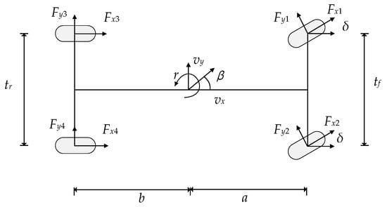 As the comprehensive consideration of accuracy and simplicity, a commonly used dual-track vehicle dynamic model is established in Figure 1 involving vehicle’s longitudinal, lateral, and yaw motions, where the influence of suspension and vehicle roll motion is ignored.