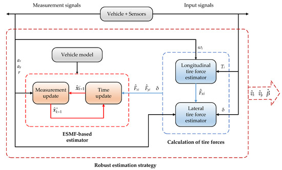Apply the steps of the ESMF algorithm in Section 3 to the state space Equation (4), and substitute the result of the tire force calculation in Section 4 into Equation (4). Subsequently, the robust estimation strategy for vehicle motion states can be constructed, which can be found in Figure 2.