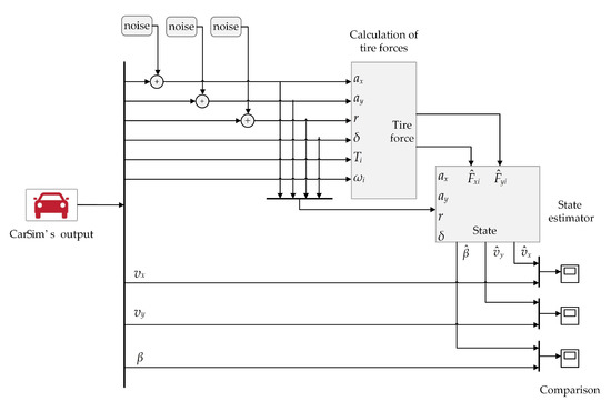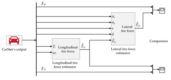 Figure 5 shows the structure for the calculation of tire forces, where the output signals of CarSim are taken as the inputs of the tire force estimators at each sampling instant. The longitudinal and lateral tire force estimators are built by use of the “S-Function” module in Simulink, where the corresponding algorithm code are integrated.