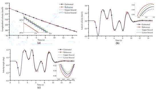 Results of the UKF-based strategy under the DLC maneuver. (a) Longitudinal velocity; (b) Lateral velocity; (c) Vehicle sideslip angle.