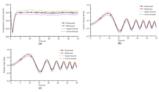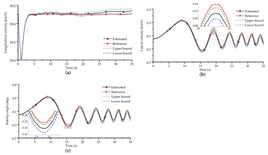 Results of the ESMF-based strategy under the DLC maneuver. (a) Longitudinal velocity; (b) Lateral velocity; (c) Vehicle sideslip angle.