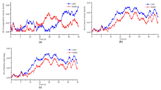 Furthermore, to clearly quantify the performance of superiority, visualized curves and statistical values are utilized, i.e., the absolute error (AE) curves and root mean square errors (RMSEs) between the estimated and reference values of these two strategies. As shown in Figure 13 and Figure 14 and Table 2 and Table 3, the AE curves in both two cases based on the ESMF algorithm are under those based on the UKF one in most time, and the RMSEs of the former are also less than the latter.