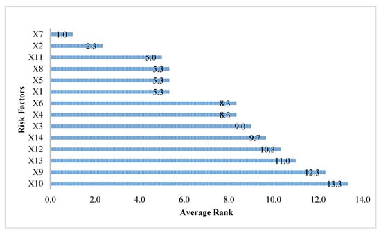 Table 2 shows the selected and ranked risk factors using the RF, MARS, and XGboost methods. Note that a risk factor with a rank of 1 indicates that it is the most important risk factor, while one with a rank of 14 indicates that it is a risk factor not selected by the method. For each risk factor, the average rank was obtained by calculating the average value of its rankings in the RF, MARS, and XGboost methods. Table 2 shows, also, the average rank of every risk factor. The ranked overall variable importance of all the risk factors is shown in Figure 2. It can be observed that X7, with an average rank of 1, is the most important risk factor, followed by X2 and X11.