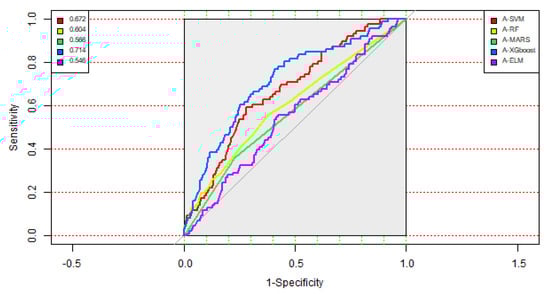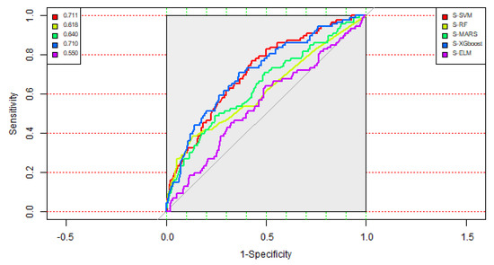 For modeling the ten models, including the S-SVM, S-RF, S-MARS, S-ELM, S-XGboost, A-SVM, A-RF, A-MARS, A-ELM, and A-XGboost models for predicting SPC in colorectal cancer patients, the process mentioned in Section 3 was used. Table 3 shows the classification results of the five single methods, including the S-SVM, S-RF, S-MARS, S-ELM, and S-XGboost models. From Table 3, it can be observed that the AUC values of the S-SVM, S-RF, S-MARS, S-ELM, and S-XGboost models were 0.711, 0.618, 0.640, 0.710, and 0.550, respectively. The single SVM model provided the highest AUC value, followed by the single XGboost model with a slightly smaller AUC value. However, it also can be seen from Table 3 that the accuracy value of the S-XGboost model was 0.641, which is significantly greater than that of the single SVM model at 0.408. Figure 3 shows the ROC (Receiver Operating Characteristic) curves of the five single classification methods for the occurrence of SPC in colorectal cancer patients. Thus, among the five single classification methods, the single XGboost model provided the best classification results.