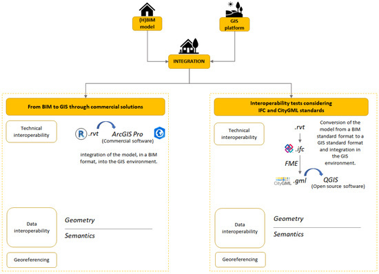 The first methodological phase (HBIM-GIS integration using a recent function in a GIS commercial solution) was aimed on importing a BIM model into the GIS environment. This test considered the native data format and represented the technical interoperability issue.