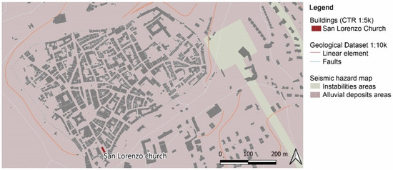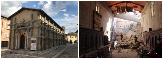 This ancient building, probably built on the ruins of a temple, was affected by many earthquakes during the years with the consequence of structural damage to the wooden ceiling in the 1950s. After the last event, on 30 October 2016, which damaged the bell-tower, the Church underwent security measures and required safety structures (Figure 2) of the entire building. It is currently still closed and the surrounding area is classified as a “Red Area”, identifying every city part damaged by the earthquake and temporary closed to the public for safety reasons.