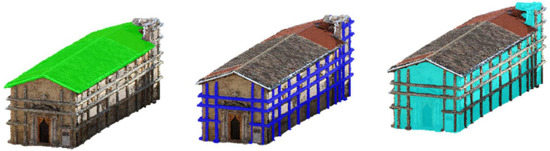 After the merging phase of the two 3D dense point clouds the model has been filtered and the context has been excluded, considering only the building geometries. Then, the point cloud has been segmented in three different regions (roof, security elements and walls) (Figure 3), to simplify the modeling phase, and exported in .rcp data format supported by the BIM software used.