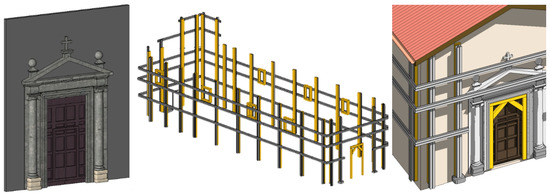 For the achievement of LoD 3, the visualization of window and door fixtures is required. Concerning historic buildings, these detailed architectural elements cannot be modelled using the default families provided by the object-oriented software, therefore customized families (.rfa) have been created starting from the default ones. Thus, for the representation of all those architectural elements, which are not part of the default Revit system families, such as the safety structures of walls, doors and windows (Figure 6), customized families have been used starting from metric generic model. Finally, they have been imported into the main project.