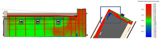 The deviation between the point cloud and the model. The highest deviation is noticeable on the damaged wall and bell tower (blue rectangle), in particular on the top of the side wall is due to the collapsed parts (ashlars and masonry) purposely not modelled.