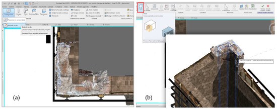This problem is caused by the typical conformation of the historic building walls, usually tapered. To deal with it, Revit allows us to alter geometries by creating a component as a subtraction solid using a local model (Figure 8a,b). This solution has been adopted for the bell tower considering the uniqueness of the geometry to be represented.