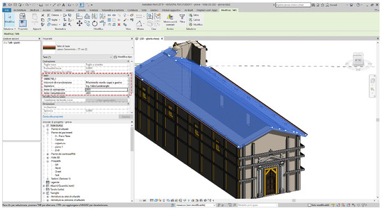To deepen the level of detail it has been necessary to model the Church in a proper environment that could allow us to represent both the visible and invisible information, the geometry and the data related to it. In this regard, the HBIM models offer an adequate solution, although most of the time they still require formal simplification. In particular, in this case, elements such as the tapering of the nave walls or the arrangement of the ashlars in the collapsed part of the bell tower have not been intentionally represented as not useful for the purposes of this research. The aforementioned three segmented point clouds have, therefore, been imported in the Autodesk Revit software and used as the basis for the realization of LoD 3 of the HBIM model. To allow their use within the Revit workspace, however, it was necessary to truncate the coordinates. To correctly set the height and to facilitate modeling, the reference level has been moved from z = 0 to the point cloud altitude.