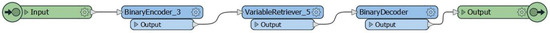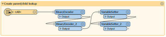 In this regard, it was necessary to insert two “Readers”: the first as “Single Merged Feature Type” and the second as “Individual Feature Type”. The first one is required to read all the IFC features and to populate the table containing the “id”, “parent_id” and “feature_type” field. The “BinaryEncoder” and “VariableSetter” transformers were used to code and to associate the values with the corresponding variable (Figure 13).