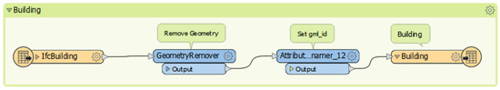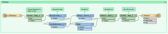 After that, for each geometric data (“IfcWindow”, “IfcBuildingElementProxy”, “IfcDoor”, “IfcRoof”, “IfcSlab”, “IfcWallStandardCase” and “IfcWall”) the same combination of transformers has been adopted. For example, the workspace created for the “IfcWindow” feature is shown (Figure 15).