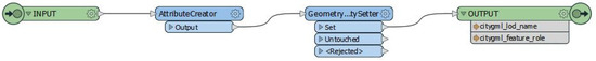 The last transformer considered in the workspace was the “CityGMLGeometrySetter” (Figure 18), created through the combination of “AttributeCreator”, which allowed the creation of the “citygml_lod_name” and “citygml_feature_role” attributes and “GeometryPropertySetter”, useful for the proper compilation of the attributes (considering the correspondences reported in the Safe Software Tutorial “Writing CityGML from FME”—Table 4).