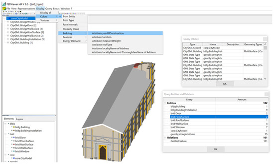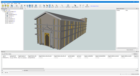 In order to verify and validate the correctness of the conversion methodology process, the model was firstly imported into the FZK Viewer. This free software, developed by KIT (Karlsruher Univerity of Techonology), allows the user to inset and query 3D CityGML models. As Figure 20 shows, here it is possible to visualize the .GML file with the IFC parameters and the CityGML characteristics.