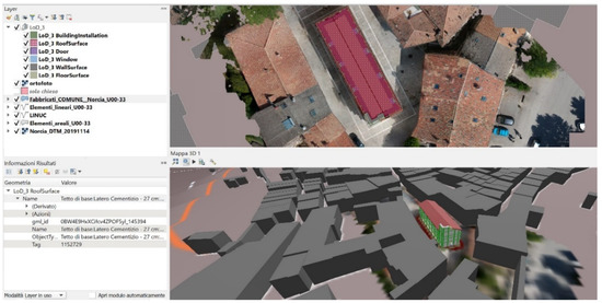Thanks to the 3D Map developed in the QGIS software, it is possible to view the cartographic data such as buildings and DTM in 2.5D and 3D. In the Figure 21 the geometry “LOD_3RoofSurface” is selected and the related information are visualised.