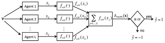 A block diagram of our proposed agent combiner is given in Figure 1. Each classification agent evaluates the test sample, , and provides a confidence score output indicating whether or not the test sample belongs to its target-type vs. clutter. The combiner normalizes the confidence scores using the weighted likelihood ratio function,