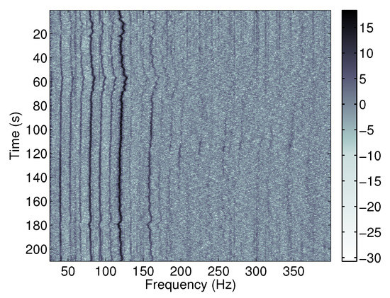 We pre-process the data and extract features in a manner that matches closely that of a previous study using the ACIDS dataset by Wu and Mendel [32]. We first estimate the CPA for each time-series. We do this by filtering the magnitude of the acoustic response with a two-second moving-average filter and estimating CPA as the point where the output achieves its maximum value. We then limit the data to a forty-second window centered on the CPA. We convert the windowed time-series into a spectrogram by taking the short-time Fourier transform with a one-second window, frequency resolution of one Hz, and fifty percent overlap. This gives a spectrogram that contains eighty time-scans and 376 frequency bins. We pass the spectrogram through a spectrum normalizer to remove the broadband energy trend, so that the end result is a spectrogram that characterizes the narrowband content of the vehicle’s acoustic signature. The normalized spectrogram for the first CPA event in the ACIDS dataset is shown in Figure 3.