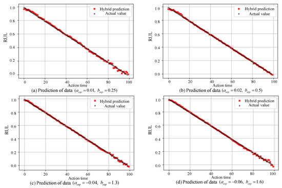 The prediction results of the hybrid model for four sorted sub-datasets (FD001, FD002, FD003, FD004) are shown in (a–d) respectively.