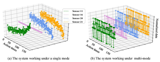On the one hand, the different number and order of mode switching makes the aging trend of systems more complicated. The aging data of the single-mode system is often used to predict remaining useful life directly. But for multi-modal systems, inter-frame dynamic information hides in aging data [14]. Thus, there is an urgent requirement to study the physical description of mode switching in the life and the cumulative effect of mode switching on the aging degree of the system. Ref. [15] used sensor sequence information to reveal the hidden characteristics of the data with multiple operating conditions to some extent. However, the work ignores the time interval between signals in the same operating mode to make the degradation characteristics of signals under varying operating modes.