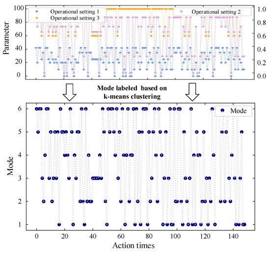 For the system working under multiple operating conditions, the trend of sensor data depends mainly on the switching of operating modes, so the degradation trend does not show a noticeable monotonic trend. As shown in Figure 5b, the same sensors 11, 16, 20 and 21 show irregular trends in FD002 (working in multi-modal). Therefore, principal component analysis method is used to reconstruct features based on the principle of maximum difference. The threshold value of total contribution is set to 95% to filter cumulative dynamic difference features of irregular sensors. More details about principal component analysis may be found in [41]. The working mode of the sample in the dataset is represented by three operational settings. To determine the mode switching sequence, k-means clustering method is used to label six working modes. The results are as shown in Figure 6.