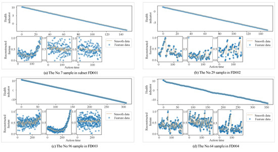 Figure 7 illustrates the comparison of a health indicator and three representative reconstructed features of random samples from different sub-datasets. The points show the data and the solid line is the smoothing data based on moving average smooth method to show the trend of the data more clearly. The experimental results show that the proposed health indicator is more monotonic and better model fitting.