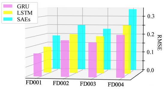 Then, the gated recurrent unit model is used to predict remaining useful life for long-term cumulative degradation. Long short term memory network (LSTM) and stacked autoencoders (SAEs) are used to compare predictions. The results are shown in Figure 8, which indicates the proposed CDDHI-GRU mode has a lower RMSE and score values than other algorithms. In addition, it was found that the values of evaluation metrics of FD002 and FD004 are higher than those of FD001 and FD003, indicating that the samples working in multi-modal switching are more challenging for obtaining accurate prediction results than those working in single mode.