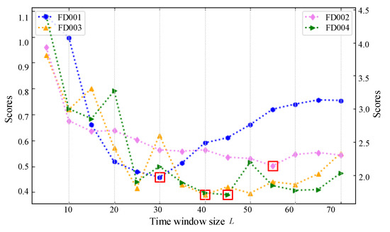 The scores of different time window sizes for four sub-datasets.