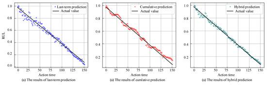 The experimental results show that the long-term cumulative prediction model is more accurate in predicting the remaining useful life of the system at the early stage of aging, and the latest stage degradation prediction model is more accurate at predicting the system in the late stage of aging. The hybrid prediction model combines the advantages of the two and has better overall prediction performance. No matter whether the system is in an early or late stage of the fault, it has a stabler prediction effect on the life cycle of the system.