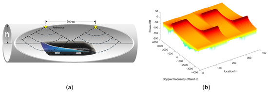 If the above, wireless access solutions are adopted in the vactrains; the traditional antennas need to be deployed inside the vacuum tube. Assume that the tube is a vacuum cylinder with radius of 2 m and the train runs at a speed of 1000 km/h. As is shown in Figure 1a, the antennas are set inside the tube every 200 m, which operates at 5 GHz with the bandwidth of 300 MHz. Figure 1b shows the doppler spectrum of this scenery. The large doppler frequency shift can be observed, which is change with respect to time.