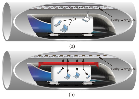 As is shown in Figure 4a, same as that of current HSR [43], the on-board MRs that are usually installed on the train roof can solve the issues of high penetration loss and group handover. These MRs are usually connected to access points (APs) installed inside the train through wired links such as optical fiber. In the uplink, the traffic from all user equipments (UEs) and the on-train equipments are first congregated at the on-board MRs through the APs, then the relay stations forward all the congregated data to the leaky waveguide by the roof antenna. In the downlink, the leaky waveguide transmits all communication data to the MRs, which then deliver the traffic to their intended UEs and train equipments through the APs inside the capsule. As the MRs are connected to the antenna installed outside of the train, it eliminates the penetration loss [43].