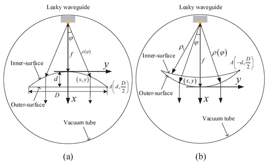 As is shown in Figure 5, there are two surfaces in the leaky lens: (a) inner-surface and (b) outer-surface. Assume that the leaky lens is a single-surface refracting lens, which means that only one surface could refract the leaky wave. The design for the single-surface refracting lens could be classified into two types in terms of the shape of the refracted surface: