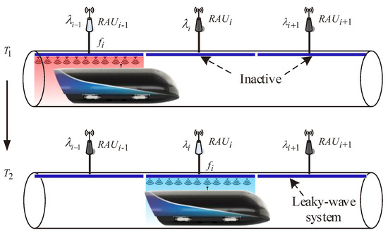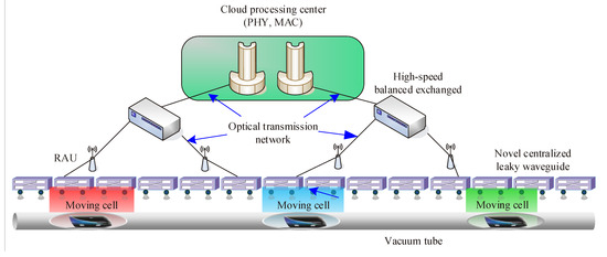The wireless access methods researched or deployed in the current HSR are based on fixed cells or segments [44]. Thus, when the train antenna exceeds the cell boundary of the BS, it needs to disconnect with the old BS and then establish a new connection with the next BS, that is, handover. Considering the leaky waveguide as a solution to provide wireless broadband access for the vactrain, and each segment leaky waveguide corresponds to a BS, with a length of, for example, 100 m. As is mentioned above, when the cell size is reduced and trains’ speed is increased, the handover rate will drastically increase. It is extremely important to keep the handover times as short as possible: the typical handover times of HSR in the order of, for example, 0.1 s to 1s are absolutely intolerable to vactrain. Thus, minimizing the handover times will be the most important challenge. To remedy this situation, the moving cell scheme based on the Centralized, cooperative, cloud radio access network (CRAN) is adopted to reduce the handover time.