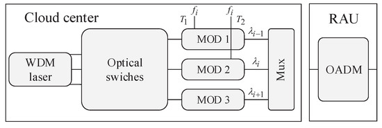 The concept of moving frequency can be implemented in C-RAN architecture, which is illustrated in Figure 6. Specifically, the cloud processing center can deploy the next RAU and activates the corresponding leaky waveguide that the train will access through the optical transmission network according to the exact train location information [49]. The ring network can get all the RAUs that are within the range of the cloud processing center connected with the same optical fiber. In addition, using Wavelength Division Multiplexing (WDM), every RAU can be assigned to a specific wavelength. Further, the fixed Optical Add Drop Multiplexer (OADM) is deployed in each RAU, thus the fixed wavelength is terminated in each RAU. The idea is then to put the desired frequency for a certain RAU on the right wavelength, which can be done through the use of some optical switches in combination with a WDM laser. Figure 7 shows a basic optical switching structure, through which the optical switches can be realized. The WDM laser will generate a beam of light that contains the desired wavelengths. The entire beam is then sent to the optical switch, where the right wavelengths are passed to the different RF modulators (each generating the same RF). The mux will multiplex all the modulated wavelengths, and then transmitted through the optical fiber to the right RAU. The RAU equipped with the OADM dropping the corresponding wavelength will transmit the information on RF through leaky waveguide. In other words, the traditional handover process is replaced by the optical switching process, which could be as low as 5 ns to 1 ms. Based on this, the overlapping length of leaky waveguides should be at least 0.3 m with the train speed of 1000 km/h and the optical signal switching process delay of 1 ms. The basic principle of moving frequency with the consideration of single frequency RF signal is shown in Figure 8.