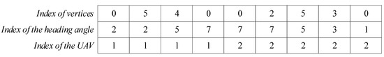 - Randomly generate the same number of heading angle indices according to the number of elements in Ak, place them in the second row of Ak, and place UAV index, k, in the third row of Ak, then the routing scheme of UAV k, denoted as Rk is obtained;