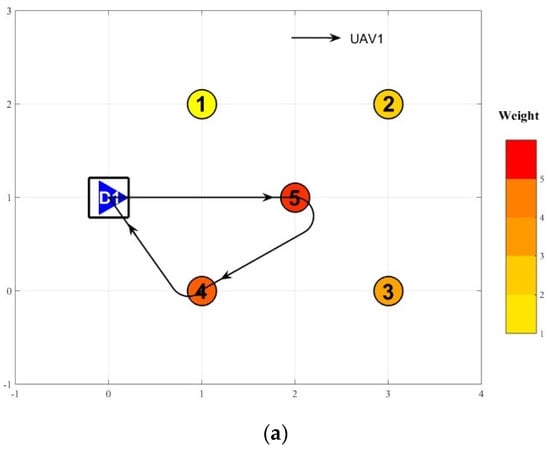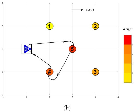 For the above two scenarios, K heterogeneous UAVs visit potential targets after launching from different depots whose indices corresponds to the UAV indices, and finally return to their respective departure depots. The number, K, of UAVs used increases from 2 to 4. The relevant parameter values of the UAVs used in the simulation experiment are shown in Table 5.