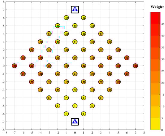 To evaluate the influence of the turning radius of UAV on the routing scheme, we select 10 benchmark instances with a routing number of k = 2 for Set 6. The number of vertices of these benchmark instances is N = 64, and the vertex positions and weights are shown in Figure 6.