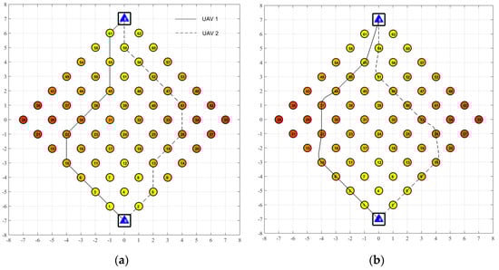In Figure 7a, UAV1 and UAV2 each visit 10 targets, while in Figure 7b, UAV2 visits 10 targets and UAV1 only visit nine targets. The results indicate that increasing the turning radius will lead to a longer path; therefore, the optimal routing scheme for the classic TOP violates the UAV endurance constraint. For example, in Figure 7b, if the 61# target is visited by UAV1, the path length of UAV1 will reach 17.6784, which exceeds TMAX = 17.5 of UAV1. The results of Numerical Experiment 1 show that if the impact of the turning radius on the path is not considered in the route planning, the path planned is likely to be impossible for the UAV to execute, which leads to task incompletion or even failure.