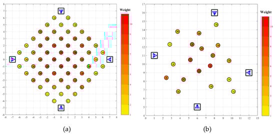 Schematic diagram of simulation experiment scenes. (a) the even distribution dataset, denoted as E; (b) the clustered distribution dataset, denoted as C.