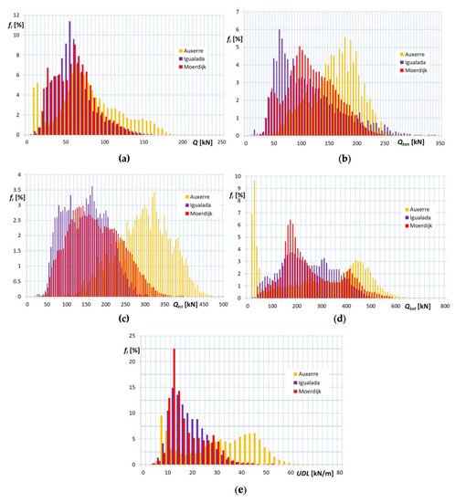 In order to enhance the significance of the comparison, the relative frequencies of axle loads, ; tandem axle loads, ; tridem axle loads, , and total weight of lorry are reported in the bar chart diagrams of Figure 2a–d, respectively. In the diagrams, Auxerre data are in yellow ochre, Igualada data in violet and Moerdijk data in red. However, considering that comparison in terms of total weight could be misleading when it refers to lorries characterized by different lengths and that the equivalent uniformly distributed load (), obtained dividing the total weight of the vehicle by its total length, is more coherent information, an additional bar chart diagram is reported in Figure 2e, illustrating relative frequencies of .