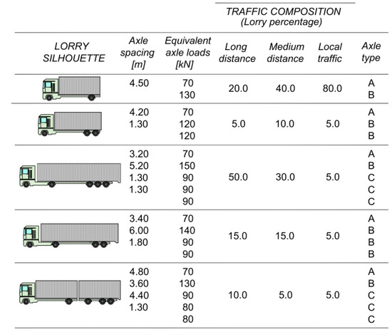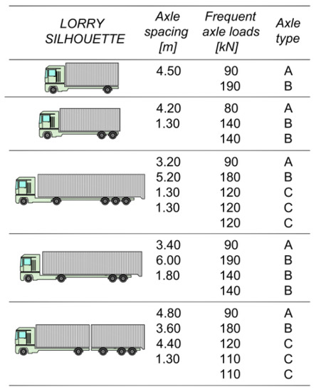 These subclasses are characterized by a number of axles varying between two and nine, but records contain also lorries with up to 13 axles. The maximum recorded lorry load resulted in being about 1140 kN, pertaining to a 10-axle lorry type O13411, 19.5 m long.
