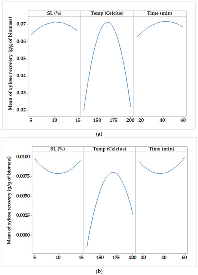 The results in Figure 1a,b showed that SL, temperature, and pretreatment time affected the xylose recovery in solid and liquid pretreated OPEFB hydrolysate. Every single line showed a slope that represented effects of magnitude, where a steeper slope designates greater magnitude of the effects. The SL of 10% was associated with the maximum xylose recovery in the hydrolysate of solid pretreated OPEFB (Figure 1a), and the pretreatment time of 37.5 min was associated with the highest xylose recovery in solid pretreated OPEFB hydrolysate (Figure 1a). A temperature of 165 °C was associated with the highest xylose recovery as shown in Figure 1a,b. The SL of 10% and pretreatment time of 37.5 min showed the highest xylose recovery on the hydrolysate of solid pretreated OPEFB. On the contrary, the SL of 10% and pretreatment time of 37.5 min in Figure 1b showed the lowest xylose recovery in the hydrolysate of liquid pretreated OPEFB. To ensure the main effect in the plot, the ANOVA result is shown in Table 2.