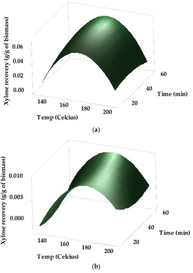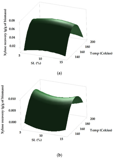 The other combination effect on xylose recovery was pretreatment time and temperature at a constant SL of 10%, as presented in Figure 4a,b. The surface plots for the effect of time and temperature at SL of 5% and SL of 15% are not shown because they were similar.